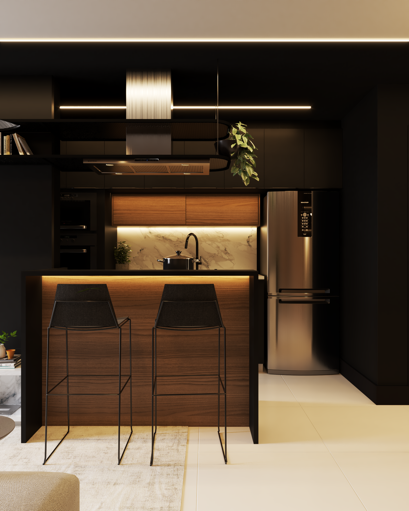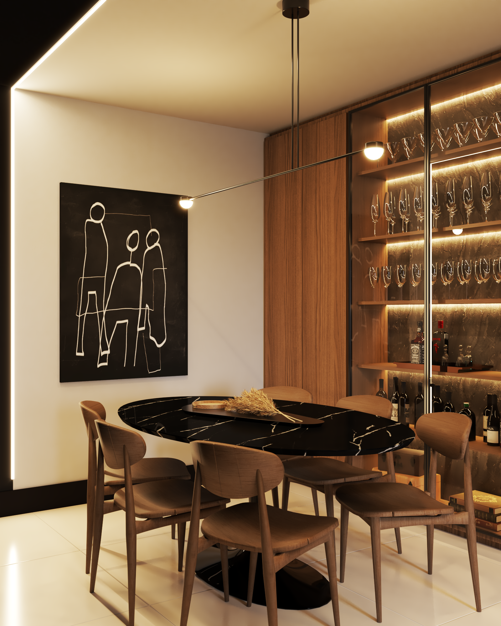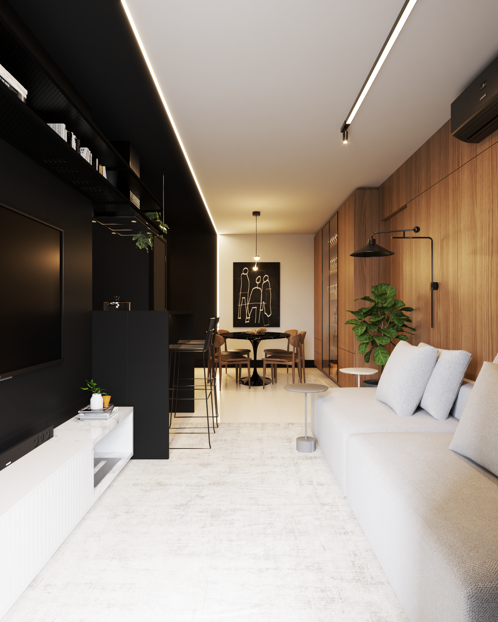 Esse apartamento é para quem gosta de preto. Um grande bloco preto hall+cozinha avança sobre as salas de jantar e estar divididos por um perfil de led. No centro da parede e do forro temos o branco e nas paredes o amadeirado. No móvel temos uma cristaleira. Mesa em nero marquina e cadeiras amadeiradas. E o pendente minimalista.