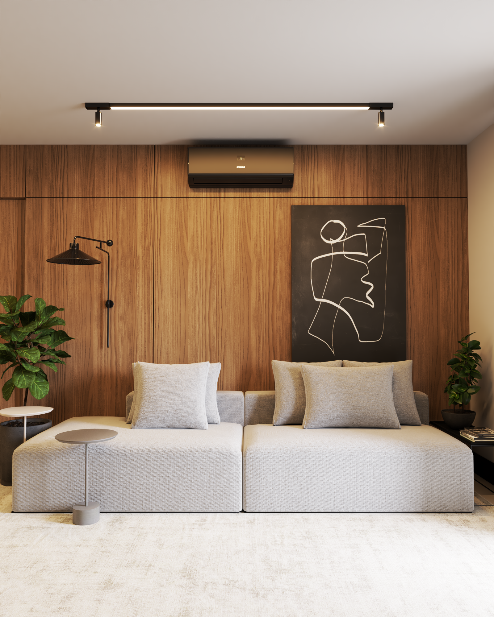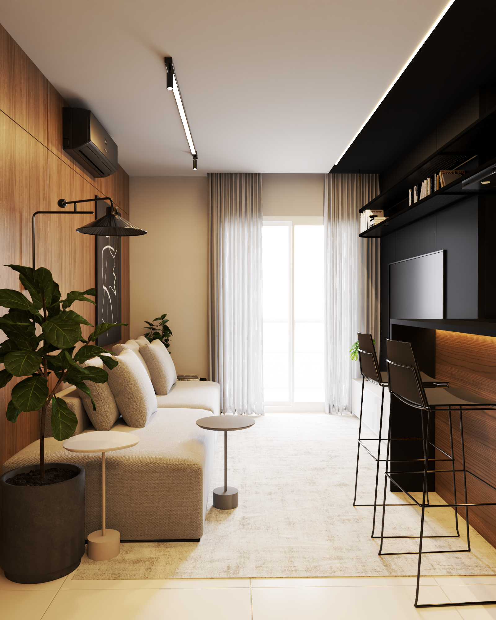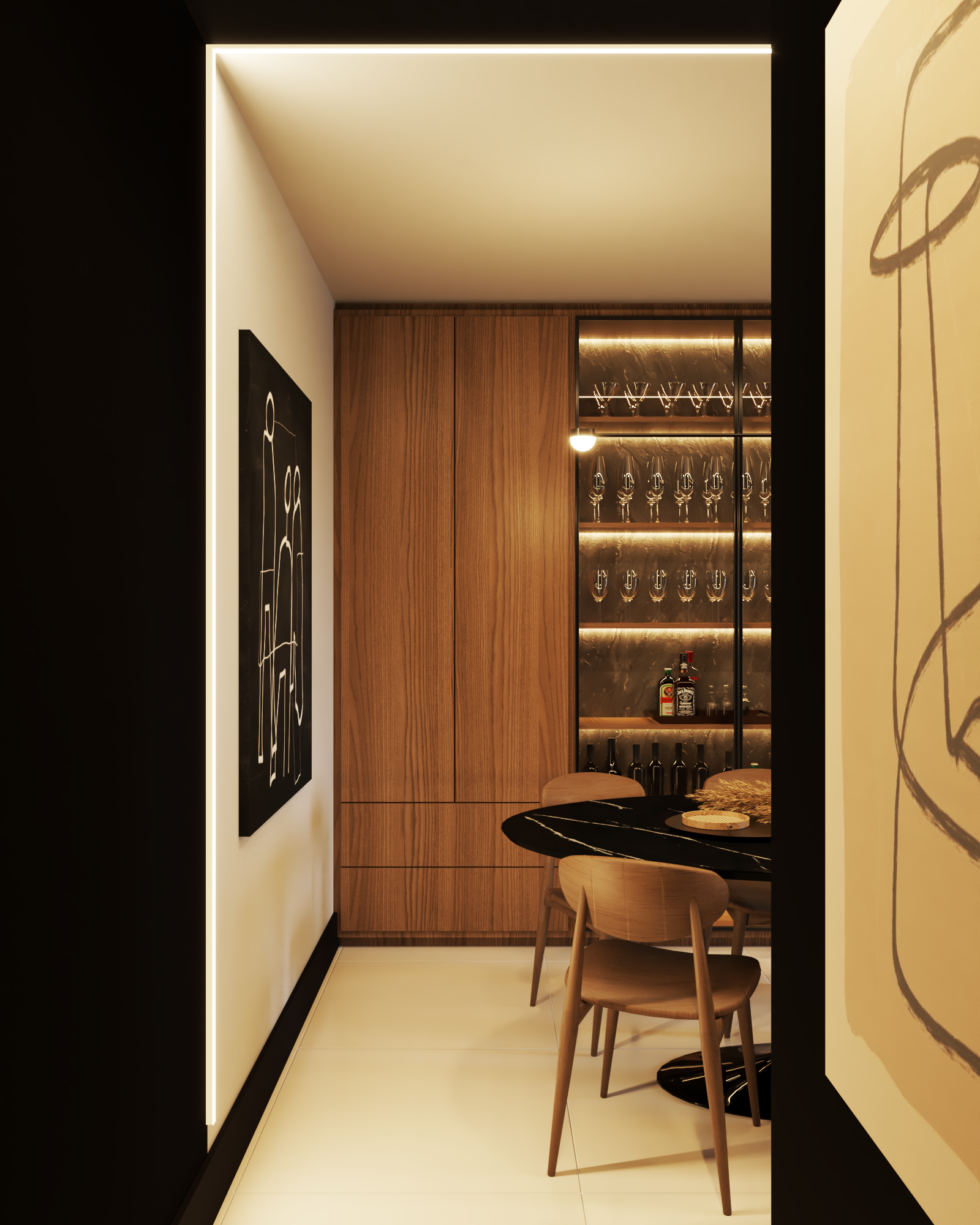 Esse apartamento é para quem gosta de preto. Um grande bloco preto hall+cozinha avança sobre as salas de jantar e estar divididos por um perfil de led. No centro da parede e do forro temos o branco e nas paredes o amadeirado. No móvel temos uma cristaleira. Mesa em nero marquina e cadeiras amadeiradas. E o pendente minimalista.