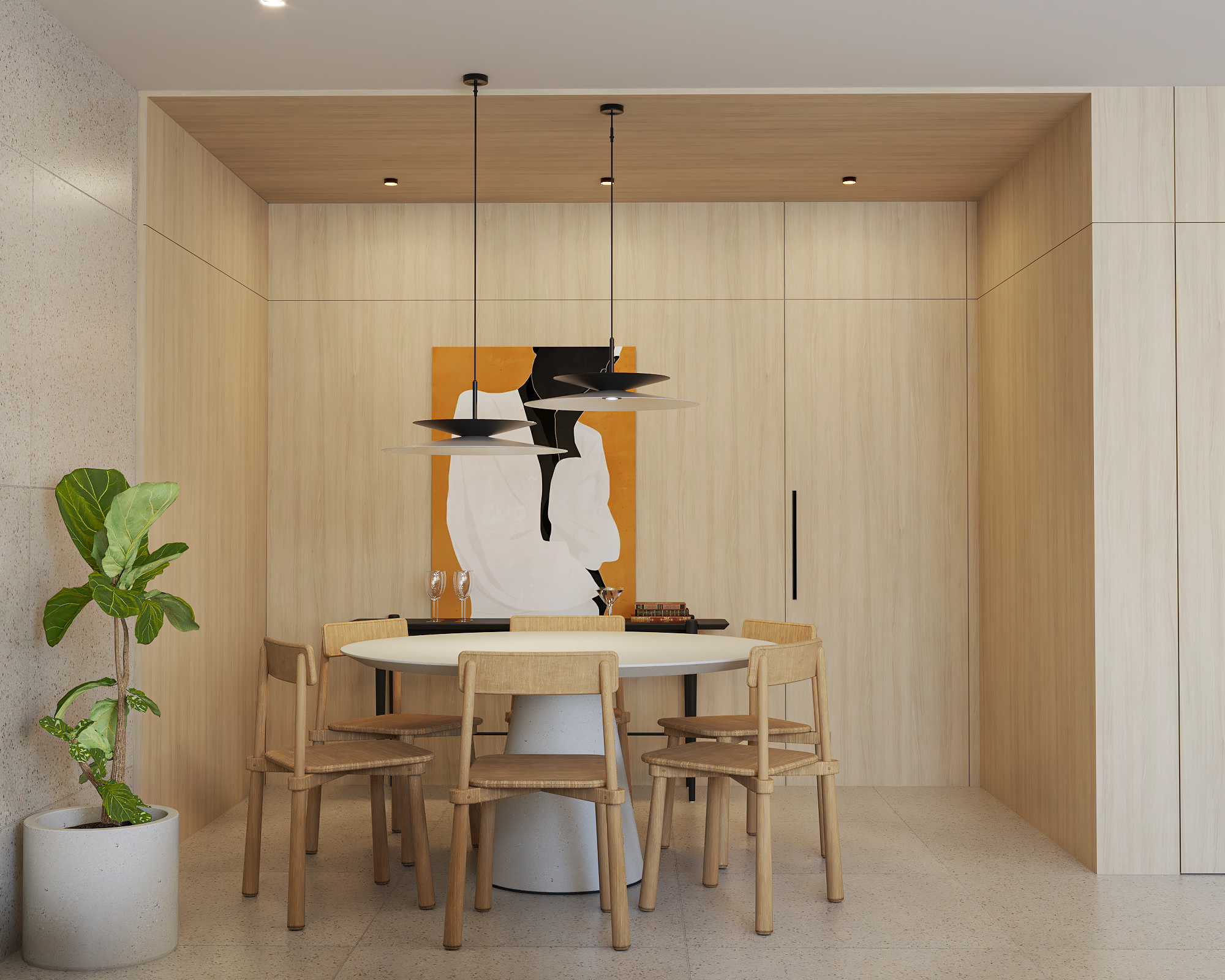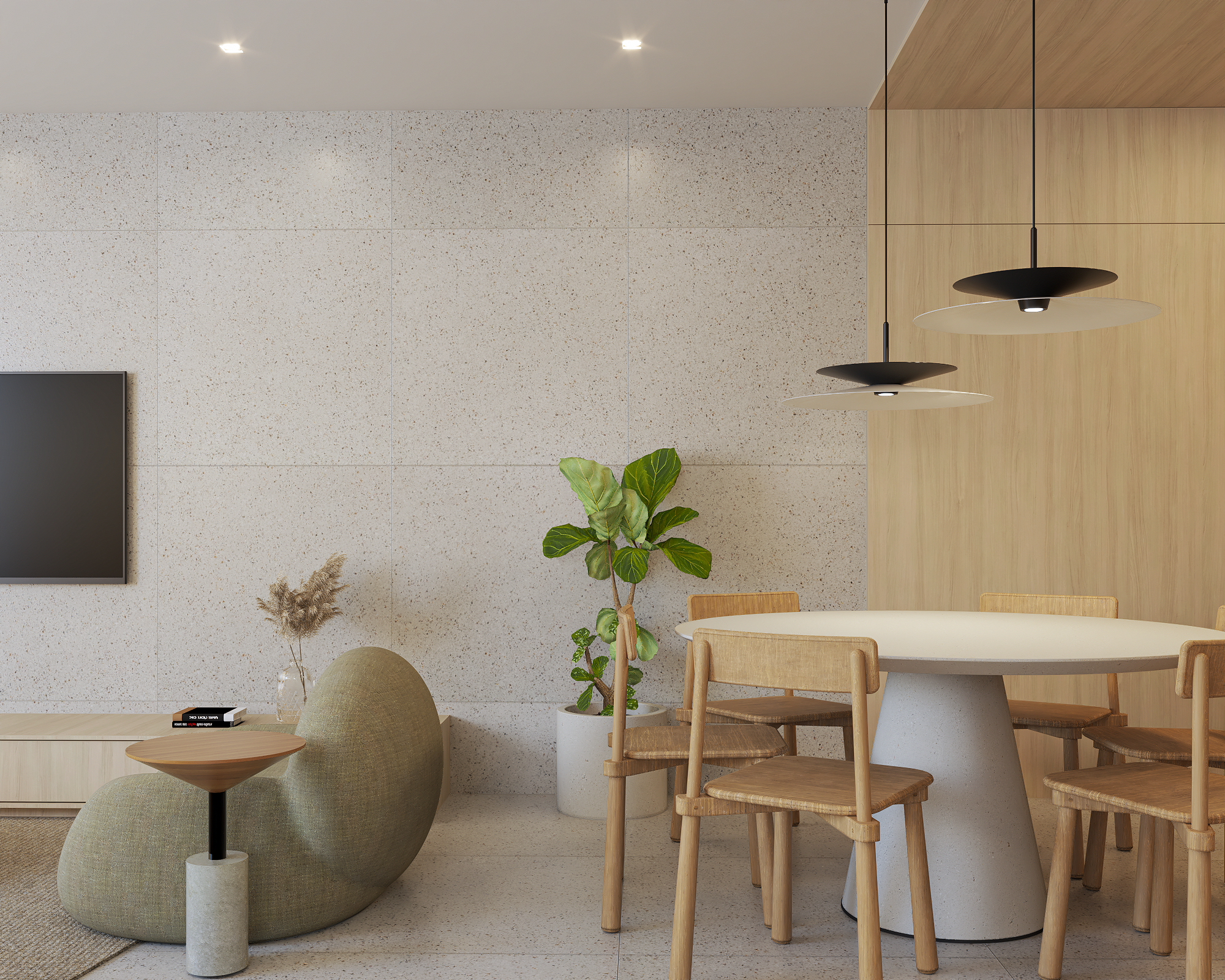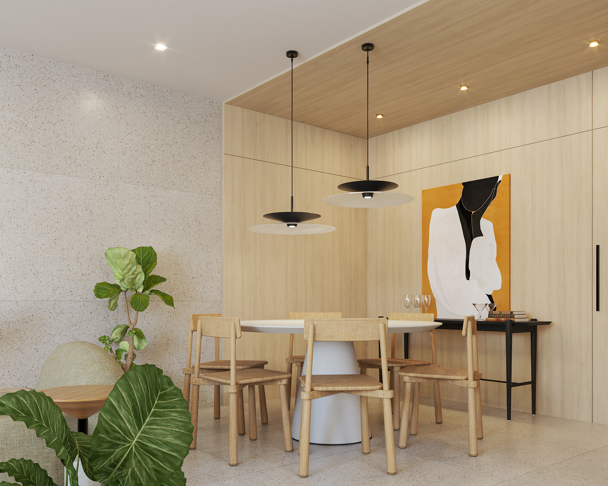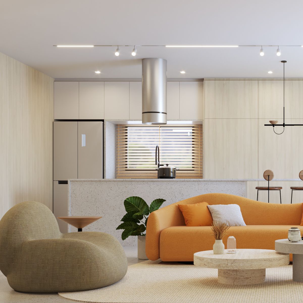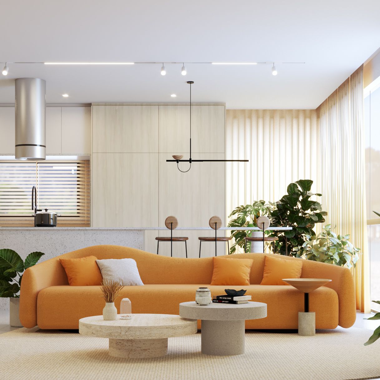 Criamos um espaço composto por tons claros e aconchegantes, com destaque pro laranja do sofá que ilumina o ambiente. As plantas trazem vida, as decorações e objetos acrescentam personalidade e charme.